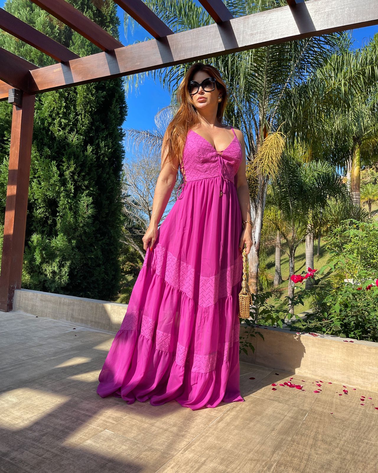O modelo possui decote em “V” e alças finas com ajuste lateral, que valorizam o colo e conferem um toque de feminilidade. A saia longa em camadas apresenta recortes com faixas de renda no mesmo tom, acrescentando charme e exclusividade ao design.